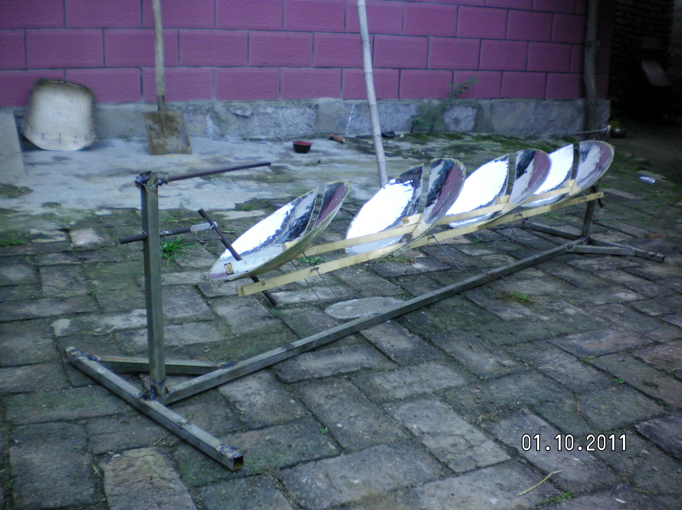 隨著全球環(huán)境惡化和日益嚴峻的能源形勢世界各國對太陽能熱發(fā)電越來越重視?,F(xiàn)在最常用的太陽能熱發(fā)電系統(tǒng)主要有槽式、蝶式和塔式,槽式和蝶式的光熱部件必須隨聚光鏡做相應的運動,槽式各個光熱部件復雜昂貴,蝶式光熱部分只能單獨使用塔式的受熱部分出現(xiàn)故障很難維修這三種系統(tǒng)都有自己的缺點。基于此我設計了平行定焦太陽能聚光集熱發(fā)電系統(tǒng):主要有一對支柱.一對轉(zhuǎn)軸.一對動臂.旋轉(zhuǎn)拋物面聚光鏡.一根托桿.一根平行桿.平行連桿組成將兩支柱固定在一條直線上,兩轉(zhuǎn)軸安裝在兩支柱上兩轉(zhuǎn)軸可以左右轉(zhuǎn)動,兩動臂安裝在兩轉(zhuǎn)軸上使可以隨轉(zhuǎn)軸左右前后擺動。托桿安裝在兩動臂上,平行桿與托桿平行安裝在兩動臂上,這樣動臂.托桿.平行桿構(gòu)成一個平行凹框。在旋轉(zhuǎn)拋物面鏡原點安一橫軸并切去部分旋轉(zhuǎn)拋物面鏡,在橫軸兩端垂直安裝兩根平行連桿,把旋轉(zhuǎn)拋物面鏡的橫軸安裝在托桿上。在平行桿上安裝連桿軸把平行連桿與連桿軸連接在一起。所述旋轉(zhuǎn)拋物面鏡的焦距等于托桿與轉(zhuǎn)軸之間動臂的長度。將動臂對準太陽陽光就會聚焦到固定點上在這些位置安裝光熱部件就會得到熱能用于熱發(fā)電。這種結(jié)構(gòu)是雙軸定焦所以效率很高,抗風性好。這種結(jié)構(gòu)可以做成很小裝在高在15-20cm的透明罩內(nèi)安裝在樓頂或樓房南墻上,為人們提供開水或蒸汽。請看模型照片: