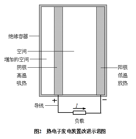 根據(jù)熱電子發(fā)電裝置的結(jié)構(gòu)可知,在陰極溫度、陽(yáng)極溫度不變的情況下,或在陰極與陽(yáng)極之間的溫度差不變的情況下,如果使陰極的左表面與絕緣容器的左內(nèi)表面之間增加一個(gè)空間(見(jiàn)圖2),則陰極的左表面要向增加的空間發(fā)射熱電子,陰極發(fā)射出的熱電子數(shù)要增加,陰極的電勢(shì)要升高,陰極與陽(yáng)極之間的電勢(shì)差要增大,熱電子發(fā)電裝置的輸出功率要增大,熱電轉(zhuǎn)換效率要提高。