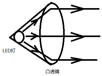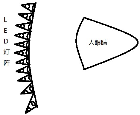 為了解決由于距離近無法看清圖像的問題,我利用用凸透鏡把每個(gè)LED燈的光線都由發(fā)散光聚焦,但并不是聚焦為平行光,而是仍略有發(fā)散,使人眼能夠看清圖像。這樣做的目的是防止不同使用者戴眼鏡位置不同而可能發(fā)生的看不清圖像的問題。如圖: