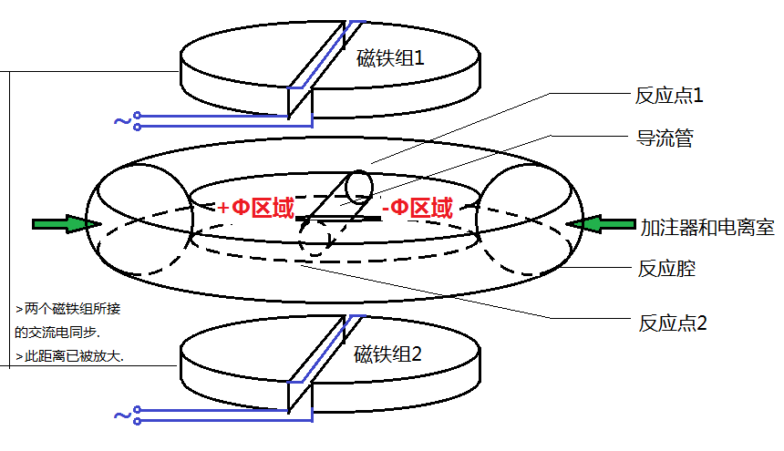 如圖, 兩組電磁鐵平行放置, 反應(yīng)腔夾于磁鐵之間. 每個(gè)電磁鐵組水平均分為兩半, 中間以狹縫隔開. 其線圈繞組使得在通交流電時(shí)兩半的磁場方向相反, 大小相同. 兩組電磁鐵通以同步高頻交流電, 于是就可以使兩組電磁鐵之間的半邊磁通量變化, 從而在反應(yīng)腔所在的位置產(chǎn)生渦旋電場. 兩邊的渦旋電場在反應(yīng)腔中部橫穿的導(dǎo)流管處疊加. 導(dǎo)流管兩端自然產(chǎn)生主、副對(duì)撞點(diǎn), 即反應(yīng)點(diǎn)1和2. 反應(yīng)腔內(nèi)同時(shí)還存在水平方向同軸的環(huán)形磁場(此點(diǎn)與托卡馬克相同), 用于約束粒子沿環(huán)形軌跡運(yùn)動(dòng), 并在反應(yīng)點(diǎn)處收緊以壓縮等離子體.