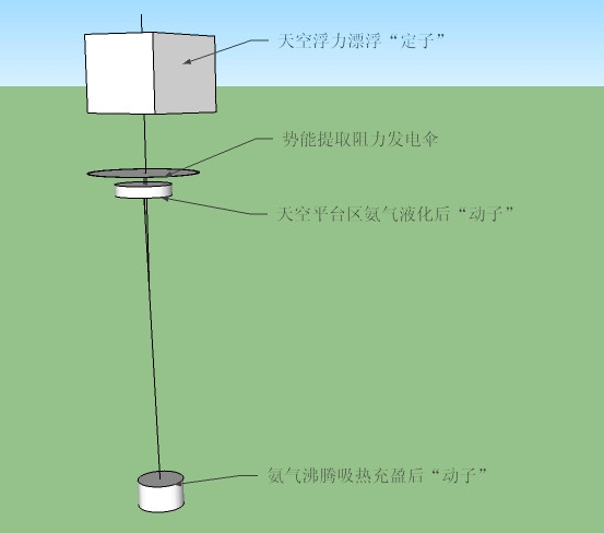 如上圖所示:設計一種系統(tǒng),在地面的時候“動子”里面的物質呈氣態(tài),而且單位體積明顯輕于空氣,就會形成比較大的浮力,使“動子”具有上升的趨勢,放開“動子”任其在浮力下,自由上升,當上升到一定高度后,“動子”內的氣體由于溫度明顯下降而液化成液體,這時浮力消失,“動子”在重力作用下會快速下落。這就形成了一個利用熱能、勢能、動能之間相互轉化而形成的一個“永動系統(tǒng)”而且能從外界獲取可觀能源來發(fā)電。只要做出“動子”上升時保溫,上升到一定高度后能自由撤銷保溫狀態(tài)進行熱交換就可以了。