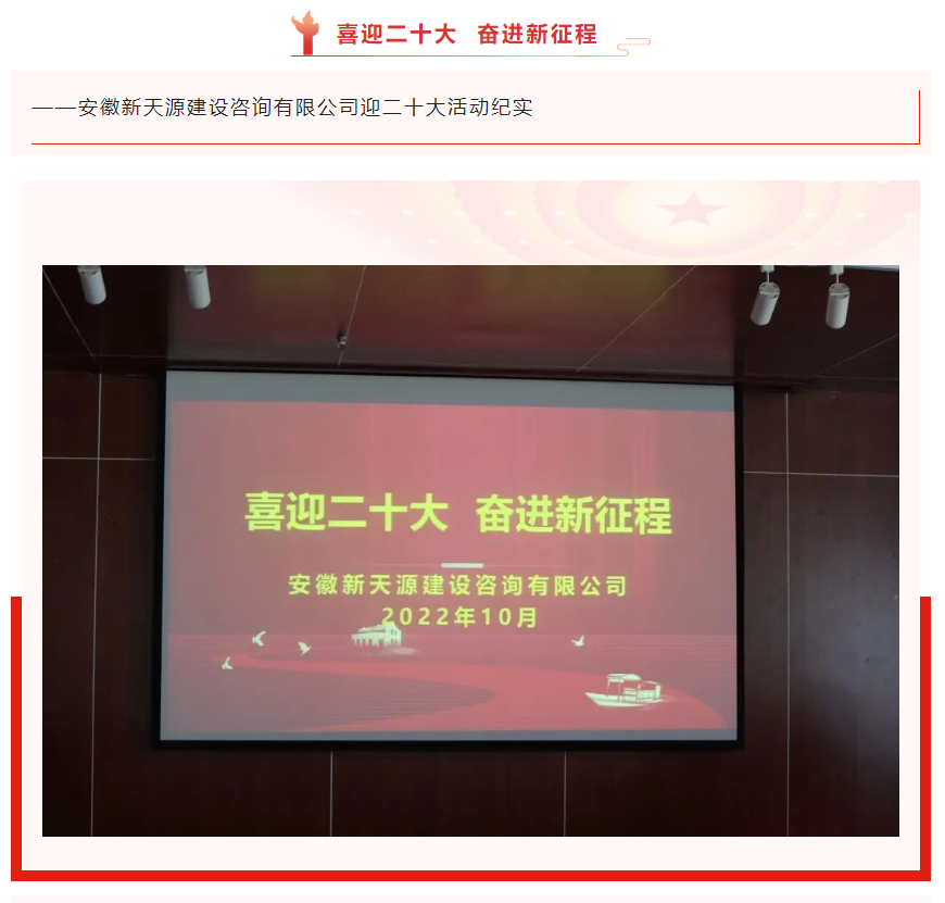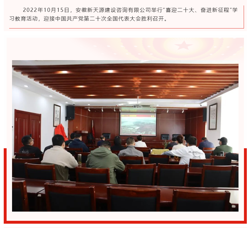喜迎二十大 奮進(jìn)新征程——安徽新天源建設(shè)咨詢有限公司迎二十大活動紀(jì)實 作者: 安徽新天源建設(shè)咨詢有限公司 最后修訂: 2022-10-15 17:13:07 摘要: