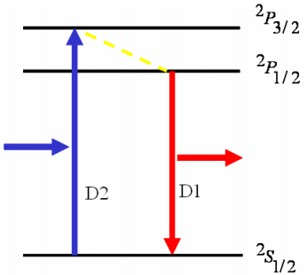 半導(dǎo)體泵浦堿金屬蒸氣激光器(DPAL,Diode Pumped Alkali vapor Laser),是由半導(dǎo)體激光器(LD,Laser Diode)作為泵浦源,堿金屬飽和蒸氣作為激光的增益介質(zhì)以實(shí)現(xiàn)高功率的激光輸出。堿金屬元素包括鋰(Li),鈉(Na),鉀(K),銣(Rb),銫(Cs),它們最外層只有一個(gè)價(jià)電子,表現(xiàn)出相似的能級結(jié)構(gòu)如圖2-6所示。2S1/2為基態(tài)能級,2P1/2和2P3/2為自旋-軌道相互作用而劈裂的激發(fā)態(tài)能級,其中2P1/2 → 2S1/2躍遷對應(yīng)D1譜線,稱為激光躍遷;2S1/2 → 2P3/2躍遷對應(yīng)D2譜線,稱為抽運(yùn)躍遷,對堿金屬蒸氣進(jìn)行抽運(yùn)就是要實(shí)現(xiàn)2S1/2和2P1/2能級之間的粒子數(shù)反轉(zhuǎn)。