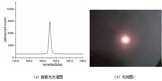 電子所是在國內(nèi)率先開展DPAL研究工作的單位之一,2012年5月,電子所實(shí)現(xiàn)了半導(dǎo)體泵浦線偏振基模銣激光輸出,經(jīng)繼續(xù)對實(shí)驗(yàn)進(jìn)行改進(jìn),獲得了最高2.8W的銣激光輸出,光光轉(zhuǎn)換效率達(dá)21%。實(shí)驗(yàn)光路如圖2-7所示,實(shí)驗(yàn)測量的銣激光光譜以及光斑如圖2-8所示。