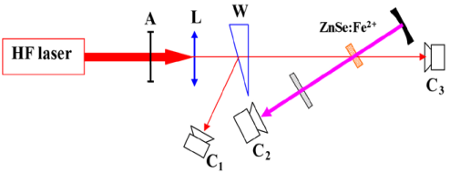 但是Fe2+:ZnSe激光器的實(shí)現(xiàn)也存在一個(gè)難點(diǎn),即在室溫下難以實(shí)現(xiàn)激光輸出,這是由其自身的能級特點(diǎn)所決定的。目前電子所采用自行研制的脈沖HF激光器泵浦Fe2+:ZnSe晶體,取得了比較好的效果,在室溫下實(shí)現(xiàn)了脈沖能量高達(dá)80 mJ的激光輸出。實(shí)驗(yàn)光路如圖2-11所示。實(shí)驗(yàn)未采用垂直入射泵浦方式,而采用小角度斜入射的泵浦方案,解決了雙色鏡鍍膜難的問題。