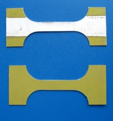 (3)安全性測試:將如圖3-4所示的經(jīng)過激光除漆和未除漆的兩組樣品分別編號,采用美國MTS公司810型材料試驗(yàn)系統(tǒng)對兩組樣品首先進(jìn)行材料拉伸試驗(yàn)。在最能反映材料強(qiáng)度的抗拉強(qiáng)度一項(xiàng),除漆組樣品的平均值為399.6 Mpa,未除漆組的平均值為399.3 Mpa,兩組幾乎沒有差別。