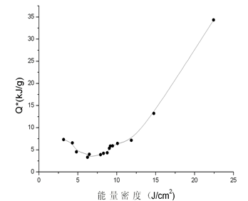 如圖3-5所示,單位面積除漆質(zhì)量先是隨著能量密度上升,在能量密度為6~8 J/cm2之間達(dá)到峰值,隨后下降。當(dāng)激光能量密度大于12 J/cm2后,單位面積除漆質(zhì)量顯著下降,此時(shí),激光與樣品表面的作用機(jī)理可能已發(fā)生突變。而進(jìn)一步分析Q*值(Q*=激光能量密度/單位面積除漆質(zhì)量)隨能量密度的變化曲線,如圖3-6所示??梢钥闯?,當(dāng)能量密度大于10 J/cm2后,Q*值隨著激光能量密度的提高大幅提高,說明激光能量的利用效率顯著下降。且在入射激光能量密度為6.5 J/cm2時(shí),Q*值為極小值,約為3 kJ/g。