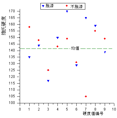 最后采用顯微硬度計(jì),測量樣品除漆前后的維氏硬度(HV)。測量結(jié)果如圖3-7所示,可以發(fā)現(xiàn),在高于均值的樣品中,除漆的有5個(gè),未除漆的有6個(gè),并且分布表現(xiàn)出無規(guī)律性,所以飛機(jī)蒙皮經(jīng)過激光除漆后維氏硬度并沒有明顯差別。