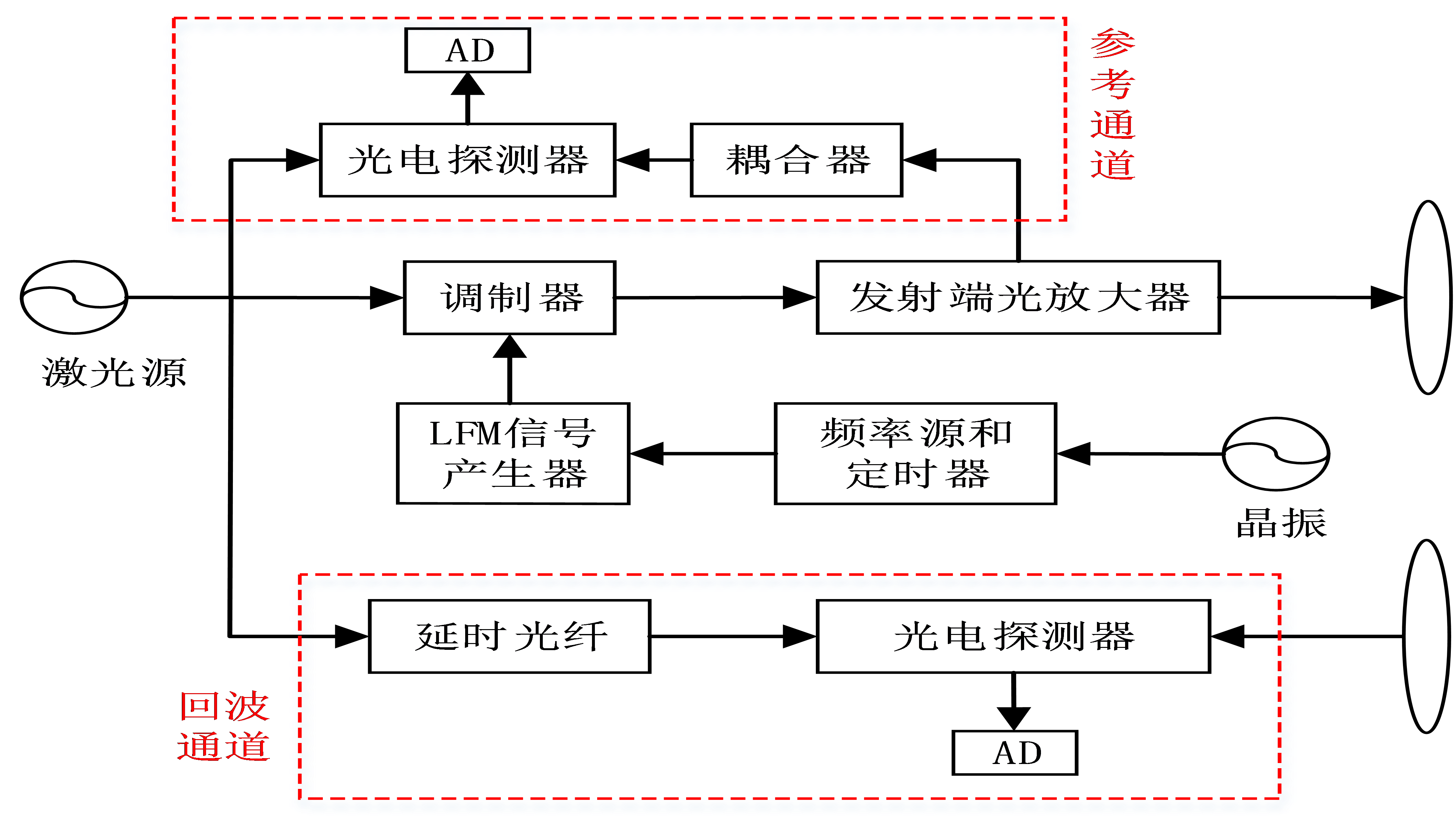 設置發(fā)射信號參考通道對其非線性失真相位實施定標校正,以及通過本振延時光纖實現(xiàn)信號相干性保持方法如圖2所示。