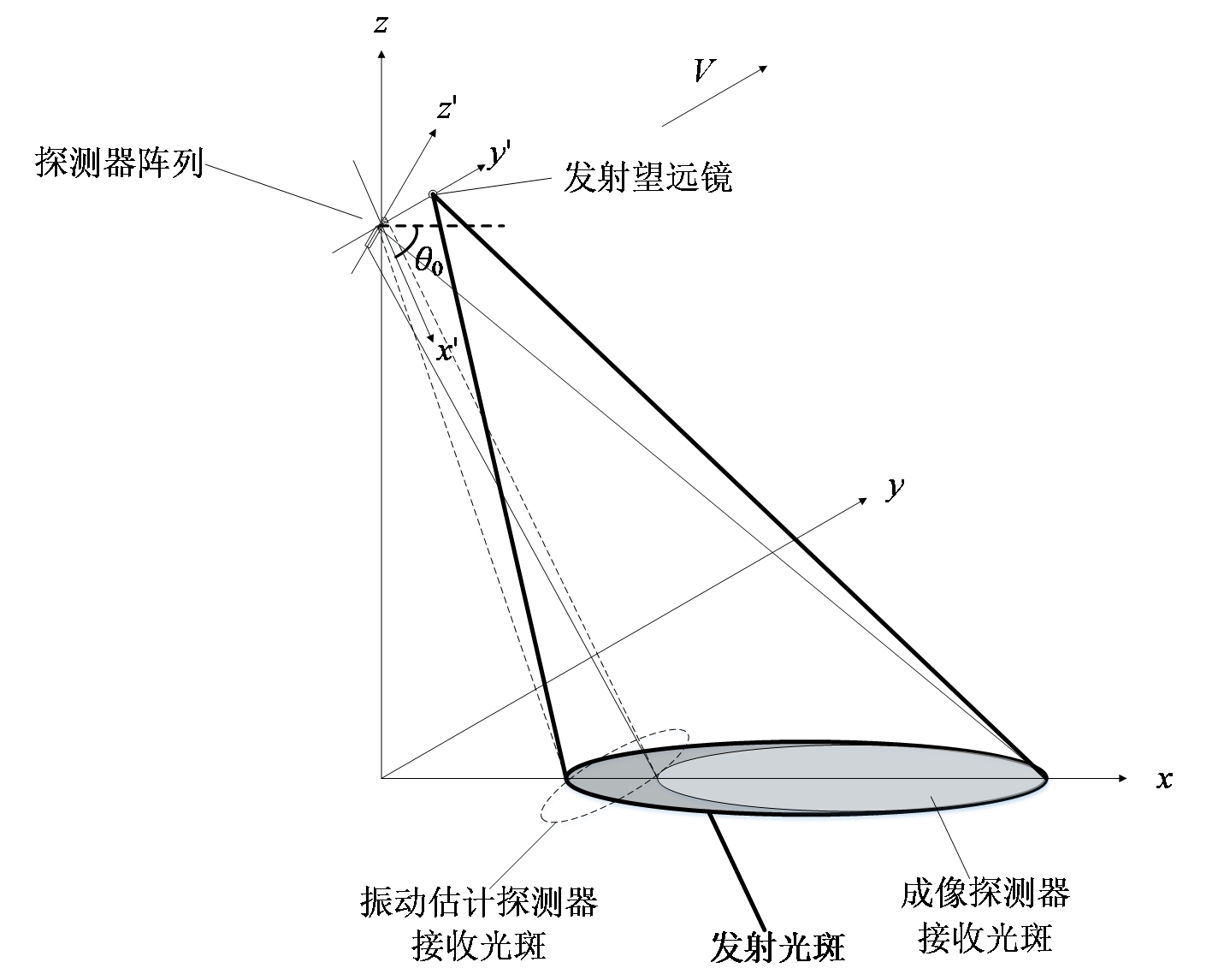 與傳統(tǒng)光學系統(tǒng)圖像概念不同,SAL獲取的圖像在斜距-多普勒頻率兩維。需要寬的接收視場,但不要求具有高的空間角分辨率,具備采用一個或少量光電探測器實現(xiàn)激光雷達寬視場接收的使用條件,在原理上可用“非成像光學系統(tǒng)”。據(jù)此特點,SAL應可通過偏置探測器在“離焦”狀態(tài)形成重疊視場,以進行振動相位誤差估計,也應可通過“散焦”擴大瞬時觀測范圍。