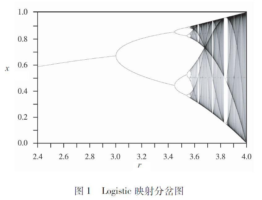 首先給大家介紹一下非線性動(dòng)力學(xué)的基本概念。考慮到在座的大多是等離子體方面的專家,對(duì)非線性動(dòng)力學(xué)不太熟悉,因此我就從最簡單的離散映射系統(tǒng)開始為大家進(jìn)行介紹。這個(gè)映射系統(tǒng)雖然看起來非常簡單,但足以讓大家比較好地理解非線性動(dòng)力學(xué)的基本概念。Logistic映射數(shù)學(xué)表達(dá)式是xn+1=rxn(1-xn),它是非線性動(dòng)力學(xué)里非?;A(chǔ)的一個(gè)例子。盡管Logistic映射看起來很簡單,但它已經(jīng)是一個(gè)動(dòng)力學(xué)系統(tǒng),即它的狀態(tài)變量是隨時(shí)間演化的。對(duì)于我們現(xiàn)在討論的Logistic映射,比如說第n步是xn,那第n+1步是什么呢?很簡單,由映射關(guān)系就可以得到xn+1。我們來觀察它隨時(shí)間會(huì)如何演化,比如說從x0開始,迭代第一步得到x1,再得到x2,一直迭代下去我們最終可以觀察到映射的穩(wěn)態(tài)結(jié)果,那我們究竟可以觀察到什么樣的穩(wěn)態(tài)行為呢?這其實(shí)就是非線性動(dòng)力學(xué)研究的一個(gè)主要內(nèi)容。我們來看這么一個(gè)簡單的Logistic映射,圖1給出了它的分岔圖。顯然,映射最終的穩(wěn)態(tài)行為是與映射的參數(shù)有關(guān)系的,通過圖1的分岔圖我們就可以觀察映射在各個(gè)參數(shù)下的穩(wěn)態(tài)行為。