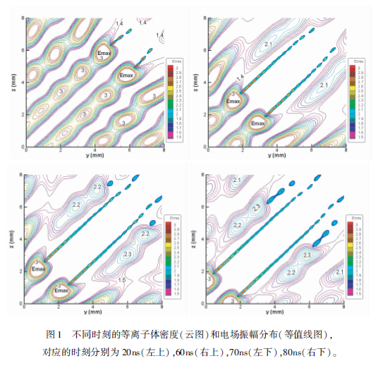 下面看一下相交微波束大氣擊穿的模擬結(jié)果,我們首先算了同頻率微波相交的情況,此時(shí)相干疊加之后,由于干涉作用,會(huì)形成電場(chǎng)強(qiáng)度強(qiáng)弱分布。我們首先模擬一下種子電子在弱場(chǎng)區(qū)的情況。因?yàn)樵诖髿庵蟹N子電子是偶然出現(xiàn)的,有可能出現(xiàn)弱場(chǎng)區(qū),如果出現(xiàn)在弱場(chǎng)區(qū),它需要擴(kuò)散,擴(kuò)散到強(qiáng)場(chǎng)區(qū)之后電子碰撞分子發(fā)生雪崩電離,形成的等離子體沿著強(qiáng)場(chǎng)區(qū)做趨源運(yùn)動(dòng),運(yùn)動(dòng)方向沿著)=:的這條線。形成的等離子體的區(qū)域是一個(gè)等離子體絲帶,當(dāng)然如果把氣壓降低,會(huì)發(fā)現(xiàn)絲帶就會(huì)過渡為一個(gè)等離子體帶。圖1給了幾個(gè)典型時(shí)刻的等離子體密度分布和場(chǎng)強(qiáng)的分布,在20ns的時(shí)候,由于靠近等離子體區(qū)域最強(qiáng)的場(chǎng)是沿著)=:這條線的,當(dāng)?shù)入x子體絲帶長度增加到一定程度的時(shí)候,在其左上和右下區(qū)域,相當(dāng)于把兩個(gè)微波場(chǎng)隔開,這兩個(gè)區(qū)域相當(dāng)于只有一個(gè)單微波的作用,在兩邊有新的等離子體絲帶。如果初始電子出現(xiàn)在強(qiáng)場(chǎng)區(qū),電子碰撞分子就會(huì)雪崩電離,形成等離子體。等離子體區(qū)域也是沿著J=:這條線做趨源運(yùn)動(dòng)。下面簡單比較了同頻和非同頻微波相交的大氣擊穿,同頻相當(dāng)于相干疊加,非同頻相當(dāng)于非相干疊加,模擬時(shí)間都是80ns,初始的種子電子數(shù)都一樣,可以發(fā)現(xiàn)在相干的情況下,即使把種子電子源放到場(chǎng)強(qiáng)最小的地方,產(chǎn)生等離子體的區(qū)域也大于非相干的情況,而且產(chǎn)生的最大電子數(shù)也是大于非相干的情況??偨Y(jié)主要有三點(diǎn),一個(gè)是區(qū)域隨壓強(qiáng)的變化,還有等離子體做趨源運(yùn)動(dòng),還有相干比非相干的等離子體區(qū)域比較大。