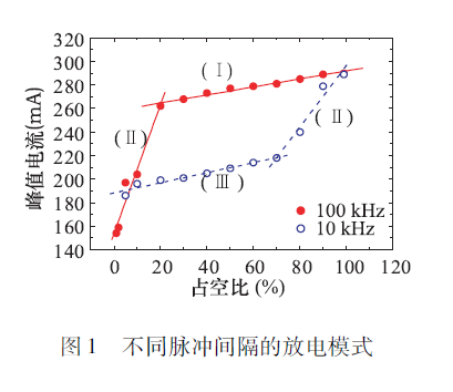 如果兩個(gè)脈沖間隔比較近,那么跟連續(xù)就沒什么差異,因?yàn)槊}沖撤銷以后,即射頻消失以后,電極間還存在的空間電荷,也就是有電子和離子分離存在,這些電子在第二脈沖上來后就會(huì)參與放電,這時(shí)與連續(xù)放電差異性就不大了。如果脈沖間隔范圍足夠?qū)?,這就成為兩個(gè)不同的放電,兩個(gè)放電之間是不相關(guān)的。如圖1( I)是脈沖之間間隔非常小的時(shí)候,稱為連續(xù)模式;下面的Ⅲ是脈沖之間間隔非常大的時(shí)候,稱為分離模式,我們可以看到整個(gè)放電的峰值電流要小不少。在它們之間,(II)稱為傳輸模式,在兩個(gè)脈沖之間,電子沒有完全消亡的情況下放電電流與占空比的關(guān)系。共有上述三個(gè)過程,可見脈沖的間隔長短對(duì)放電的影響不是由占空比決定,主要是考慮電極之間間距和里面所參與的空間電荷分布變化。