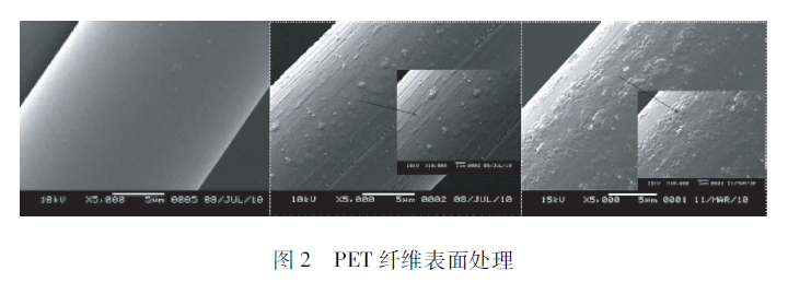 用長50cm、間距5cm的電極板做了一個(gè)射頻的放電模式。我們用上面介紹的JET做了滅菌實(shí)驗(yàn),細(xì)菌的存活數(shù)量得到了有效的下降。在這里主要看一下對(duì)化纖的處理效果,圖2的左圖是沒有處理過的,中圖是200 W處理的,右圖是800 W處理的。這兩個(gè)之間有什么區(qū)別呢?中圖顯示纖維表面有溝槽出來,這任何化纖在等離子體處理情況下刻蝕的一個(gè)特征,在低真空情況下的射頻放電都會(huì)有溝槽刻蝕出來。但是在大氣壓輝光放電的情況下,表面有許多圓形體產(chǎn)生。我認(rèn)為不單純有刻蝕,而且有表面熔融的狀態(tài)出來。所以說,在大氣壓射頻放電對(duì)表面的作用是相當(dāng)強(qiáng)的。雖然每個(gè)脈沖時(shí)間比較短,但是它的作用非常強(qiáng)。